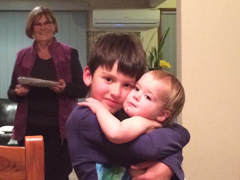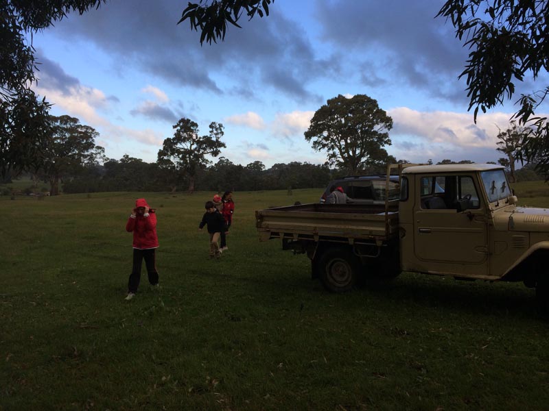 Helen & Graham Spears ont été nos hôtes durant le week-end dernier. Ils sont très francophiles, leurs 2 fils étant mariés à des françaises, et Helen parle bien français également. A la retraite, Graham a acheté cette ferme de 100 ha il y a une quinzaine d’années et l’a aménagé, surtout pour le bonheur de ses petits-enfants! 80 vaches, autant de veaux, un cheval, des kangourous en liberté, quelques émeus, un vieux 4×4 Toyota et des quads pour se promener. Leur fils Brett était également là ce week-end, ainsi que son épouse Véronique, leurs 3 enfants aux âges proches des notres, et même les parents de Véronique qui ont eux aussi émigré en Australie il y a quelques temps.