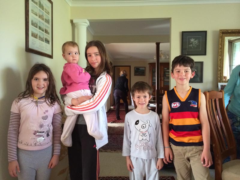 Helen & Graham Spears ont été nos hôtes durant le week-end dernier. Ils sont très francophiles, leurs 2 fils étant mariés à des françaises, et Helen parle bien français également. A la retraite, Graham a acheté cette ferme de 100 ha il y a une quinzaine d’années et l’a aménagé, surtout pour le bonheur de ses petits-enfants! 80 vaches, autant de veaux, un cheval, des kangourous en liberté, quelques émeus, un vieux 4×4 Toyota et des quads pour se promener. Leur fils Brett était également là ce week-end, ainsi que son épouse Véronique, leurs 3 enfants aux âges proches des notres, et même les parents de Véronique qui ont eux aussi émigré en Australie il y a quelques temps.