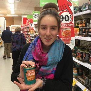 – une boite de baked beans. Personne n’aime cela, alors on a rangé la boite dans le rayon après la photo.