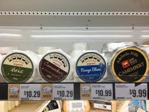 – des fromages de chez nous mais non, en fait c’est de chez eux ils ont juste piqué les noms et rajouté deux 0 au prix au kg. Si bien qu’on mange du brie au prix du caviar (et je m’y connais)