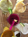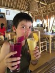 On va déjeuner dans un petit warung (restau local, également pas mal au scrabble…) qui sera notre coup de coeur du séjour côté culinaire : une cuisinière française + 1 pêcheur d’Amed (pas le taciturne, un autre) = un super restau à la cuisine « fusion ». Il a fallu expliquer à Arnaud que cuisine fusion ne voulait pas dire une cuisine où on fait cuire les choses jusqu’à ce qu’elles ressemblent à un gâteau de ma maman à un magma en fusion qui sort du volcan. On vous met qqs photos pour illustrer.