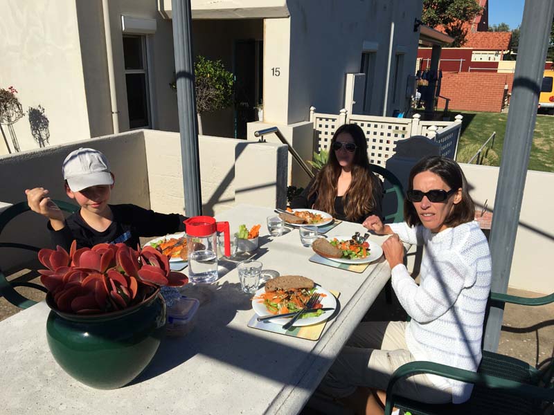 Malgré l’automne les températures restent douces. On déjeune dehors avec vue sur l’océan, on fait nos sempiternelles promenades sur la plage au soleil couchant, on achète des jeans déchirés pour des adolescentes, Arnaud continue au footy et part en camp avec l’école 3 jours, le wifi déconne à la maison donc obligé de passer à la bibliothèque.. Everything’s fine!