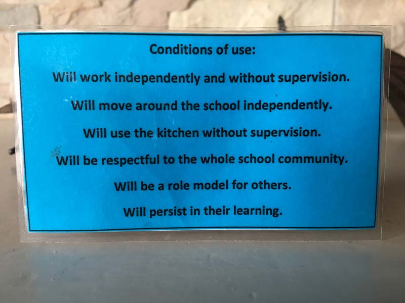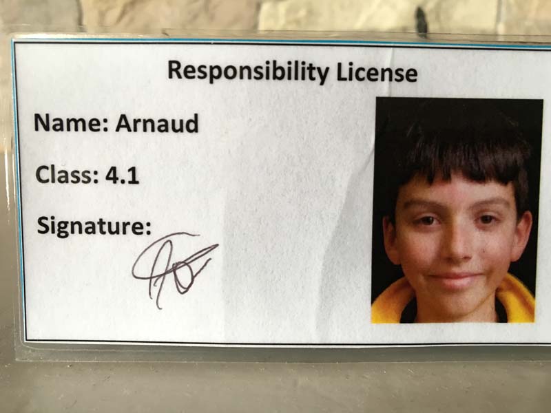 – Arnaud a obtenu sa responsibility licence. Ou permis de tuer comme James Bond d’être responsable. Oui, nous aussi ca nous a fait drôle. Un permis de manger, je dis pas, mais d’être responsable? En tous cas, il peut aller faire pipi tout seul à l’école et peut utiliser la cuisine sans supervision, c’est déjà cela! (oui, il a une cuisine dans sa classe, c’est la classe à Dallas!)